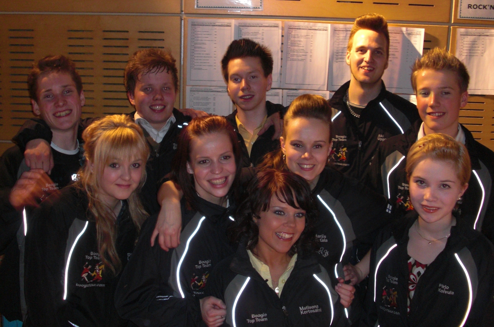 KISARAPORTIT: -------------------------------------------------------------------- Boogie Woogie Word Cup ja RS-tanssien PM 25.4.2009 Suomi, Raisio. Vuoden 2009 ensimmäinen BDWC kilpailu kilpailtiin Suomessa. Turun Boleron alla toimiva tanssikerho Flying Step vastasi kisan järjestelyistä. Samana päivänä kisattiin myös rs-tanssien PM-kilpailu (boogie woogie, lindy hop rock’n’roll, bugg ja duppel bugg). Kun molemmissa kilpailuissa oli vielä tarjolla ikäsarjoina yleinen, juniorit ja seniorit oli päivä tupattu täyteen tavaraa. Kisapäivä alkoi klo 8.00 ja päättyi puolilta öin. Boogie Top Teamin parit kahmivat mitalisijoja ja finaalipaikkoja kauden ensimmäisessä boogie woogie maailman-cup osakilpailussa ja samana päivänä kisatuissa rockn’’swing tanssien PM-kisoissa. Boogie Dance World Cupin kisassa (BDWC) Masi Sauren ja Matleena Kortesalmi tanssivat hienosti finaaliin ollen siellä kuudensia. Junioreissa Jani Koivula Emmiina Lehtinen tanssivat sijalla 4. ja Samuli Kalliala ja Mari Munne sijalle 11. PM-kisoissa tulokset olivat vielä komeammat. Masi ja Matleena tanssivat aikuisten boogie woogiessa hopeaa! Junioreissa Samuli ja Mari tanssivat buggissa hopealle ja boogie woogiessa kuudennelle sijalle. Toinen junnuparimme Jani ja Emmiina tanssi boogie woogiessa pronssille ja buggissa neljännelle sijalle. Aikuisten bugg-kisassa Boogie Top Teamin Aki Uppa ja Marja Hietala olivat lopputuloksissa parhaana suomalaisparina sijalla 14. ![]() Boogie Top Teamin parit PM-kisoissa -------------------------------------------------------------------- PM-kilpailu Suomella oli PM-kisassa 21 parin joukkue ja edustus kaikissa lajeissa, dubbel buggia lukuun ottamatta. Odotukset olivat kovimmat boogie woogiessa yleisessä luokassa ja junioriluokassa. PM boogie woogie yleinen Masi ja Matleena menivät ensimmäiseltä kierrokselta parhailla pisteillä suoraan neljännesfinaaliin. Sieltä mentiin helposti semifinaaliin ja sieltä finaaliin. Lopputuloksena huikeasti PM-hopeaa! Taakse jäivät mm. kaikki Ruotsin parit! Muista suomalaispareista parhaiten sijoittuivat Tuomas ja Reetta sijalle 18. PM boogie woogie juniorit Junioreissa Jani ja Emmiina seurasivat Masin ja Matleenan esimerkkiä ja tanssivat ensimmäiseltä kierrokselta ykkösiksi ränkättyinä neljännesfinaaliin. Hyvä vauhti jatkui ja lopputuloksena Janille ja Emmiinalle PM-pronssia! Samuli ja Mari joutuivat muiden suomalaisten tavoin hakemaan vauhtia toiviokierrokselta, mutta sieltä tultiinkin sitten komeasti aina finaaliin asti sijalle 6. PM bugg yleinen Aki ja Marjis tanssivat ensimmäiseltä kierrokselta suoraan neljännesfinaaliin, vieläpä hyvällä sijoituksella. Semifinaalipaikka jäi harmittavan pienestä kiinni. Loppusijoitukseksi tuli 14 sija. Taakse jäi kovia ruotsalaispareja mm. monilta Boogie Tourin bugg-leireiltä tutut Jana Sondell ja Fredrik Bernherdsson. PM bugg juniorit Junioreissa Samuli ja Mari tekivät historiaa tanssimalla buggin PM-hopeaa! Suomalaismenestystä täydensi vielä Janin ja Emmiinan nelossija. Kumpikaan pari ei päässyt ensimmäiseltä kierrokselta suoraan jatkoon, mutta tästä ei masennuttu vaan laitettiin lisää pökköä pesään ja ruotsalaisten housut tutisemaan. Muissa tansseissa ja ikäsarjoissa ei suomalaismenestyksestä saatu PM-kisoissa nauttia. Kaikki PM-kisojen tulokset löytyvät kisajärjestäjän sivuilta täältä BDWC-kilpailu Päivän toisena kisana tanssittiin vuoden 2009 ensimmäinen BDWC kilpailu. Kisa oli 91 parillaan yksi viime aikojen suurimmista BDWC kisoista (56 paria yleisessä ja 22 junnuissa ja 13 senioreissa). Suomella oli tässä kisassa 15 parin joukkue ja edustus kaikissa ikäsarjoissa. BDWC yleinen Masi ja Matleena pääsivät Word-rankinsijoituksensa (5.) perusteella suoraan neljännesfinaaliin. Lisäksi Suomi sai neljännesfinaaliin järjestäjämaana yhden villin kortin ja se meni Suomen ranking kakkoselle, Tuomakselle ja Reetalle. Neljännesfinaali ja semifinaali tanssittiin knockout kierroksina, pari paria vastaan. Masi ja Matleena hoitivat homman tyylikkäästi kotiin ja finaalipaikka aukesi selkein tuomariäänin. Finaalissa alkoivat päivän rasitukset jo hieman näkyä ja pari ei pystynyt aivan parhaimpaansa. Siitä huolimatta kuudes sija oli loistava suoritus. Tuomas ja Reetta saivat neljännesfinaalissa vastaansa ranskalaisen World-ranking kakkosparin Nicolas Deniau - Melanie Deniau. Suomalaispari tanssi hyvin ja vei ranskalaisilta yhden tuomariäänen, mutta se ei riittänyt joten matka tyssäsi siihen. Loppusijoitus oli 20 jolla lohkesi mukavasti rankingpisteitä näin isossa kisassa. Suomen muut parit jäivät tällä kertaa toiviokierrokselle. BDWC juniorit Junioreissa Jani ja Emmiina sekä Samuli ja Mari pääsivät Word-rankinsijoituksensa perusteella suoraan neljännesfinaaliin. Junnuissa semifinaaleita ei tanssittu aikuisten malliin knock-out kierroksina vaan normaalisti pistetekierroksina. Jani ja Emmiina selvittivät tiensä semiin ja sieltä finaaliin. Lopputuloksena Janille ja Emmiinalle hienosti neljäs sija! Samuli ja Mari selvittivät itsensä neljännesfinaalista semiin, mutta paukut eivät tällä kertaa aivan riittäneet finaaliin asti. Loppusijoitus oli 11. Kaikki BDWC-kisa tulokset WRRC:n sivuilta täältä Tämän kisan jälkeen World-rankinsijoitukset WRRC:n listalla Masi ja Matleena aikuisten listalla 3. Jani ja Emmiinna juniorilistalla 2. Samuli ja Mari juniorilistalla 5. k ä s i t t ä m ä t t ö m ä n hienoa! Onnea pareille! Yleisiä huomioita Ähky Ei ole mitään järkeä ahtaa kahta kisaa samalle päivälle. Iltakisana kisattavassa BDWC kisassa oli pareilta terävin terä pois. Yleisön näkökulmastakin pitkä kisapäivä on puuduttava. Toivottavasti jatkossa ei järjestetä tällaisia ähkykisoja. Hyvät järjestelyt Kisajärjestelyt toimivat kisaajien kannalta hyvin. Henkilökuntaa oli riittävästi ja tilat olivat hyvät. Tuloslaskenta välillä hieman takkuili, mutta sitä ei voi laittaa turkulaisten piik