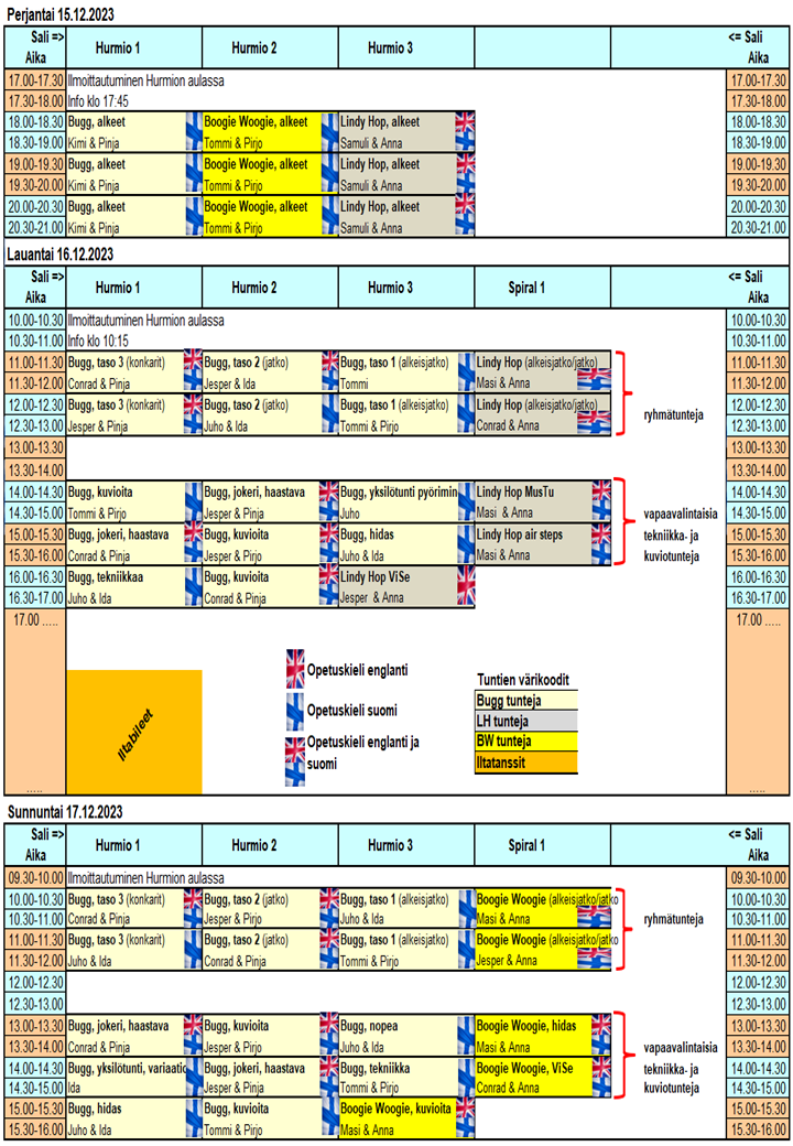 Leirin aikataulu Ryhmätunteja, kuviotunteja, tekniikkatunteja, yksilövalmennusta, iltatanssit, hauskaa yhdessäoloa. Aamupäivisin treenataan ryhmätunneilla ja iltapäivisin tarjolla on vapaavalintaisia tekniikka- ja kuviotunteja. UUTTA! Perjantai-iltana klo 18–21 on tarjolla alkeistunteja kaikista leirin lajeista, huippuopettajien luotsaamana. Tule opettelemaan uutta tai hiomaan perusteet kuntoon lauantain ja sunnuntain tunteja varten! Buggia pääsee tanssimaan kaikkina päivinä ja tarjolla on neljä tasoryhmää: alkeet (pe), taso 1 (alkeisjatko), taso 2 (jatko) ja taso 3 (konkarit). Lindy Hoppia on tarjolla perjantaina (alkeet) ja lauantaina, tasona yhdistetty alkeisjatko/jatko. Boogie Woogieta pääsee tanssimaan perjantaina (alkeet) ja sunnuntaina, tasona yhdistetty alkeisjatko/jatko. Jokainen pari voi ilmoittautuessaan itse määritellä mihin lajiin ja mille tasolle haluaa osallistua! Iltapäivien tunnit ovat vapaavalintaisia (voi esim. valita ryhmätunnit buggissa ja vapaavalintaiset vaikka lindy hopissa) Yksityistunnit tulee varata etukäteen ilmoittautumisen yhteydessä. Tulostettava versio löytyy täältä (.pdf) (Järjestäjä pidättää oikeuden muutoksiin). - Alustava aikataulu julkaistu 29.9.2023 - Opettajat ja aiheet lisätty 30.10.2023